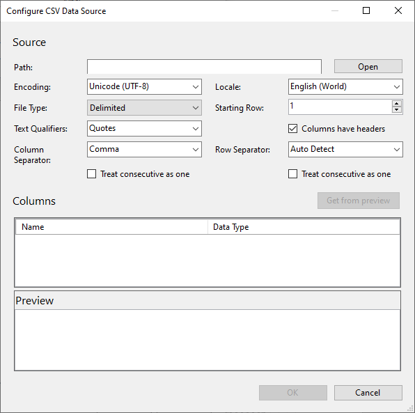 Click OK to save the changes and close the Configure CSV Data Source dialog.