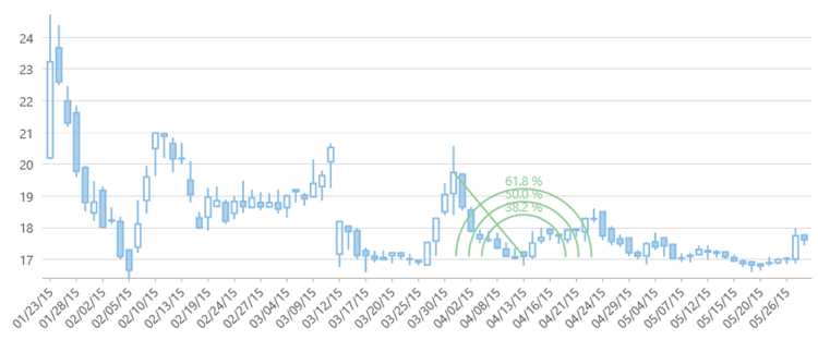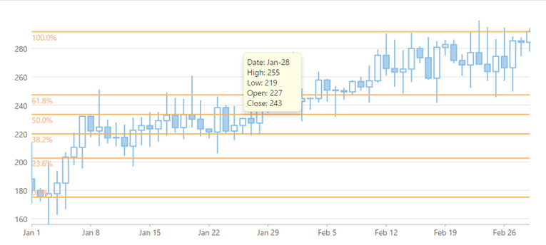 Fibonacci tool enables the calculation and plotting of various alert levels that are useful in financial charts. This topic explains how to initialize a Fibonacci tool in a FinancialChart, and use it for performing stock analysis.
