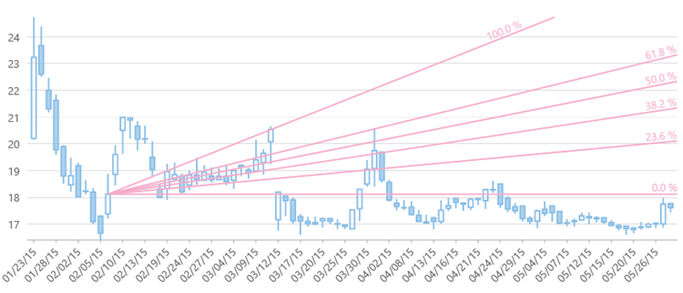 Financial charts in MVC Edition support Fibonacci Fan lines, which are trend lines that are based on Fibonacci retracement points. The rising Fibonacci Fan lines can be used to predict support levels or reversal zones, while falling fan lines can help predict resistance levels or reversal zones.