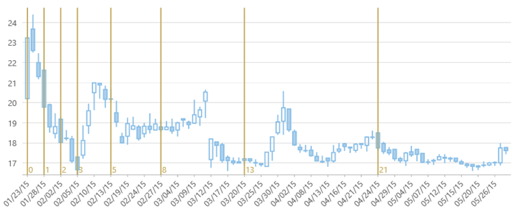 Fibonacci Time Zones are based on Fibonacci sequence and represented as vertical lines, which are used to predict reversal points in future. MVC Edition supports Fibonacci Time Zones for Financial Charts.