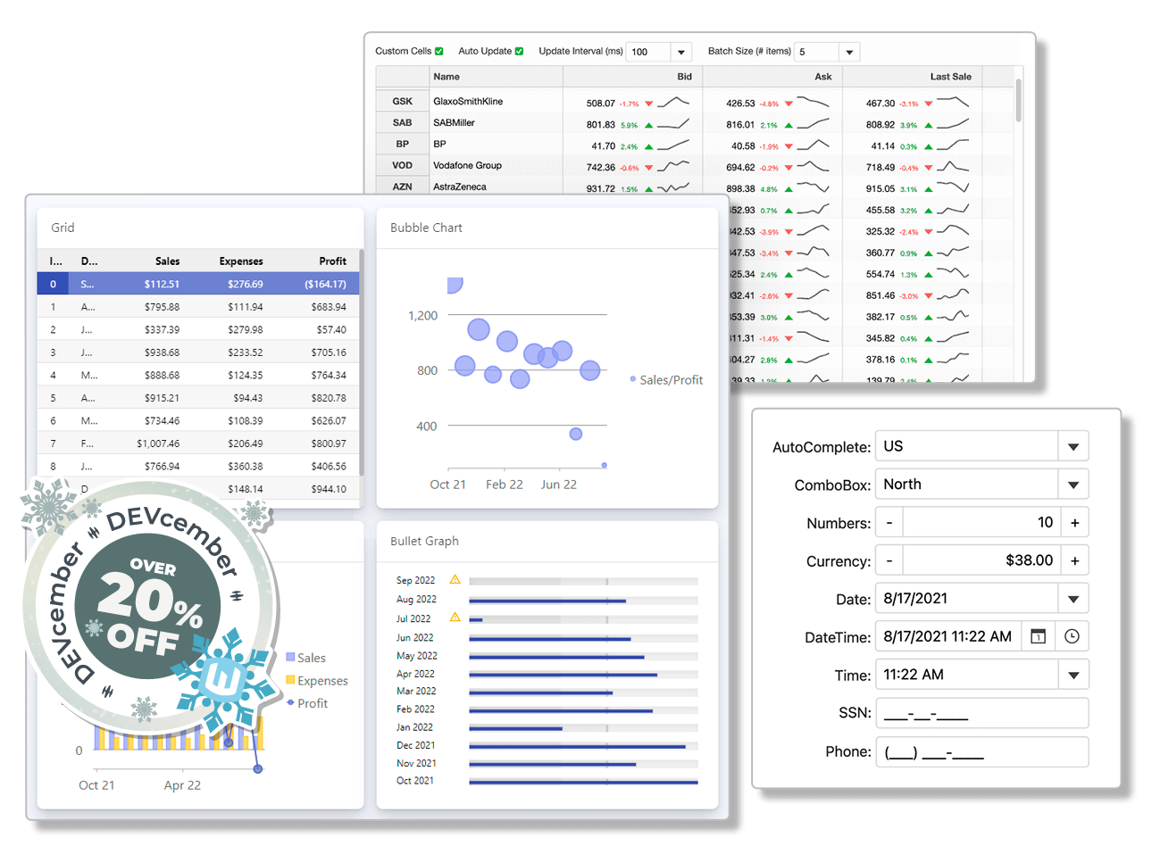 Our input controls are specialized and optimized for each data type. Create and enter data quickly and efficiently using a mouse or touch. Wijmo includes auto-complete, color picker, date/time, masks, menus, multi-selects, and more.